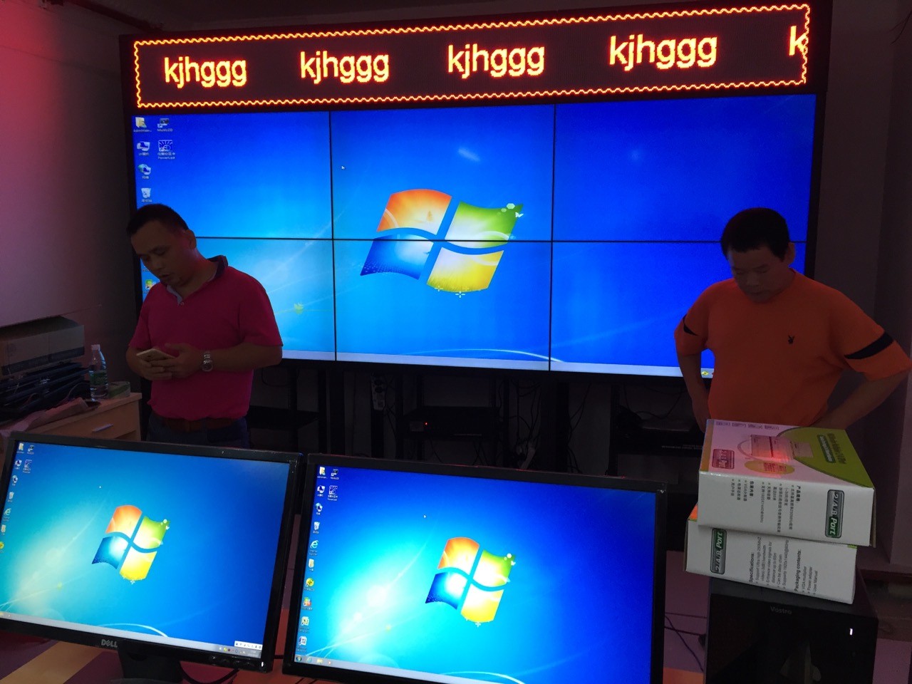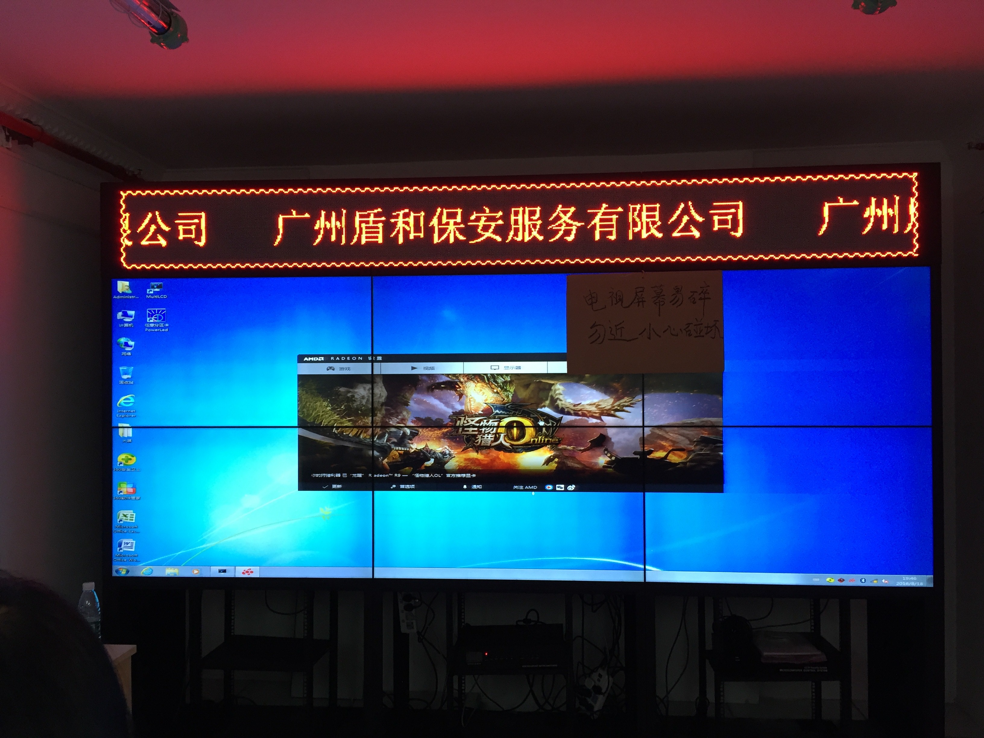 廣州某安保服務公司采用了雅迅達2×3拚接的47cunyejingpinjieping,bingdapeileduopingchuliqigaoqingxianshishebei。juzhenshiyongwangluokongzhi,dapingyeshiwangluokongzhi,keyishixianduohuamiantongshixianshi,bingqiekeyishixianziyoukaichuang,jianshichuangdechuangkoudaxiaokeyiziyoutiaokong、位置可以隨時挪動,可以隨時切換信號源。是一種非常靈活的顯示方案,對於多監控、多功能的公司顯示係統,這個使用非常合理。