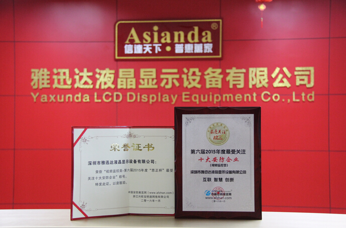 作為專業液晶顯示設備研發生產企業,雅迅達深耕液晶顯示行業15年,在液晶顯示領域取得卓越成果,是一家擁有27項專利的國家級高新技術企業。公司通過了質量管理體係、環境管理體係等國家認證,產品廣泛應用於各業,受到客戶的一致好評,連續兩年被授予“廣東省守合同重信用企業”稱號,並被評為“全國液晶顯示設備行業質量領先品牌”。