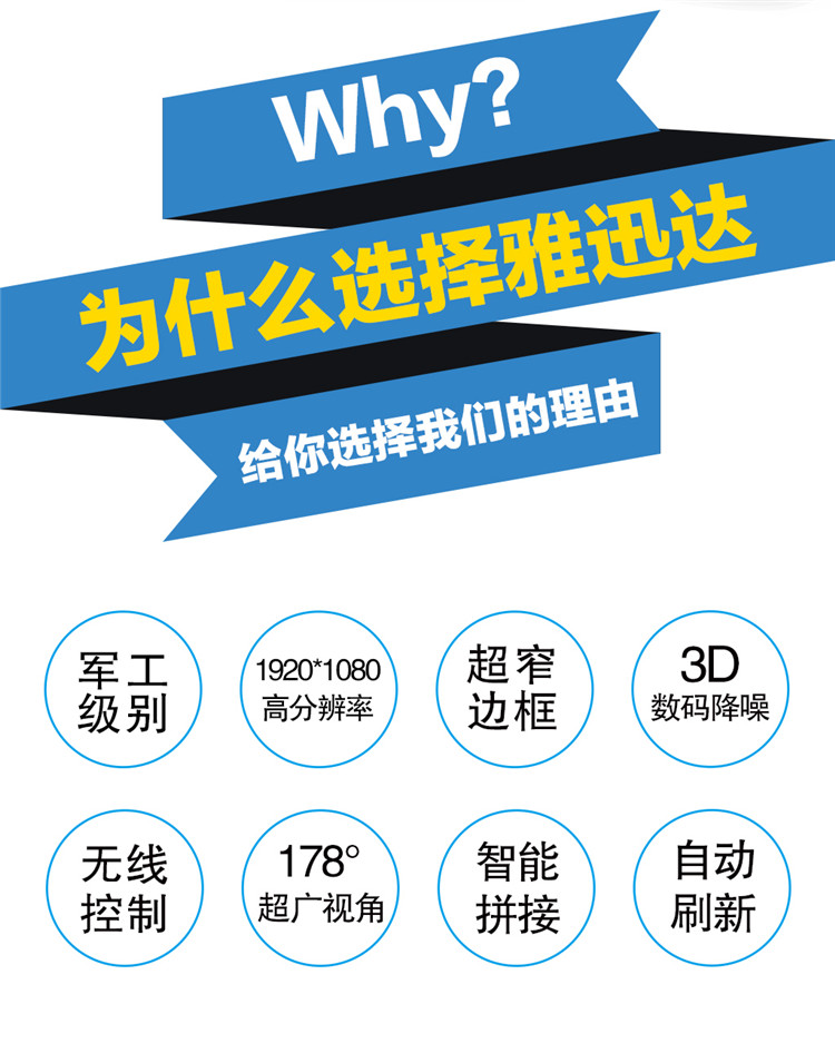雅迅達一直秉承著“信達天下、普惠萬家”為企業口號,秉承“專業、專注、專一”的企業精神和“典雅、守信、惜時、抗挫、精業”的企業意誌,堅持“4C服務、合作共贏”為原則,做出用戶體驗更好 性價比更佳的 液晶拚接產品,如需了解更多詳情請點擊深圳市雅迅達液晶顯示設備有限公司
