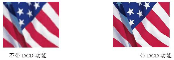 2) DCD邊緣平滑技術 DCD全稱為方向相關的去隔行,在動態畫麵中可從任何角度成像,修補畫麵邊緣,獲得更光滑、更自然的視頻圖象效果。如下圖,DCD可以去除邊緣的鋸齒現象。