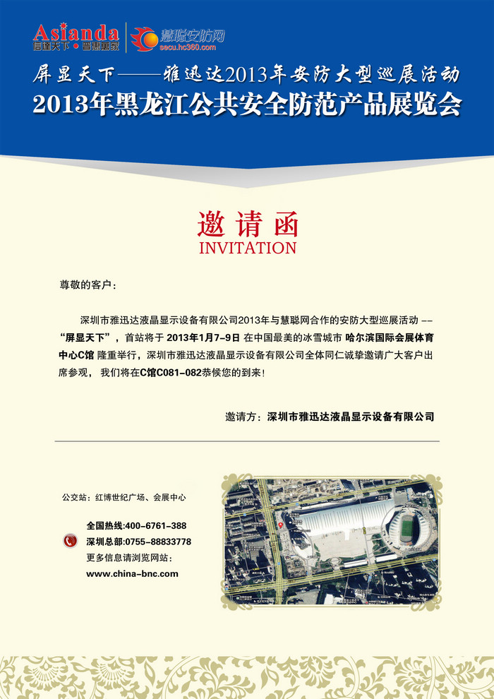 深圳市雅迅達液晶顯示設備有限公司2013年與慧聰網合作的安防大型巡展活動--“屏顯天下”,首站將於2013年1月7-9日在中國最美的冰雪城市哈爾濱國際會展體育中心C館隆重舉行,雅迅達液晶顯示設備有限公司全體同仁誠摯邀請廣大客戶出席參觀!我們將在C館 C081-082恭候您的到來!