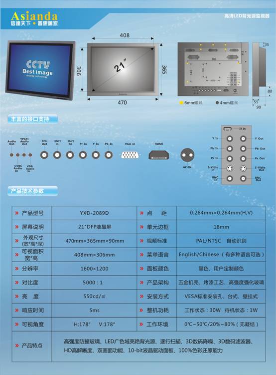 全球首台LED背光源監視器YXD-2089D係列同樣備受矚目,全新的LED背光源液晶監視器配備了目前最高端HDMI接口,支持1080p逐行掃描,解決圖像閃爍的問題。動態對比技術3D圖像處理,Qisk Mage魔(mo)術(shu)手(shou)軟(ruan)件(jian),保(bao)證(zheng)了(le)圖(tu)像(xiang)的(de)細(xi)膩(ni)平(ping)滑(hua)而(er)不(bu)失(shi)真(zhen)。超(chao)窄(zhai)邊(bian)框(kuang)設(she)計(ji),滿(man)足(zu)客(ke)戶(hu)不(bu)同(tong)工(gong)作(zuo)環(huan)境(jing)的(de)需(xu)求(qiu)。為(wei)倡(chang)導(dao)此(ci)次(ci)夏(xia)季(ji)青(qing)年(nian)奧(ao)林(lin)匹(pi)克(ke)運(yun)動(dong)會(hui)的(de)低(di)碳(tan)環(huan)保(bao)概(gai)念(nian),此(ci)款(kuan)產(chan)品(pin)更(geng)在(zai)其(qi)環(huan)保(bao)低(di)碳(tan)上(shang)下(xia)足(zu)了(le)功(gong)夫(fu),待(dai)機(ji)功(gong)耗(hao)≦1W,壽命超過了50000小時,在節約能源的同時更加符合節能環保的時代潮流。