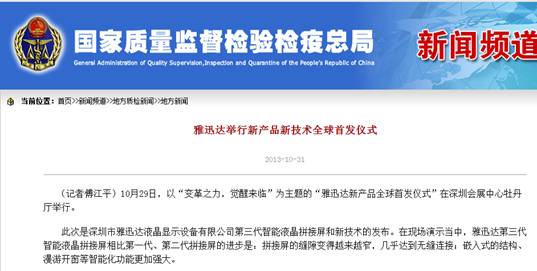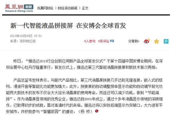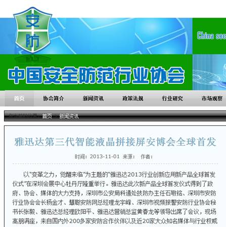 《深圳商報》此文中還重點報道了,在本屆安博會上,“雅迅達2013行業創新應用新產品全球首發儀式”在深圳會展中心舉行。據悉,雅迅達第三代智能液晶拚接屏采用三星液晶麵板,配置頂級的S-PVA技術,以及高靜態對比度功能,其高透光率可讓產品節能10%以上,全視角3D效果和超窄邊無不顯示其深厚的資源整合能力、精湛的工藝和超強的軟件優化。並重點發布了兩項新技術:拚接屏的自動調整頻率顯示功能和自動調節背光功能。“雅迅達產品已廣泛應用於國防安全、公檢法係統信息化、醫療衛生、教育係統、智能交通係統、軌道交通係統、視頻會議係統、廣告傳媒係統等眾多領域。”