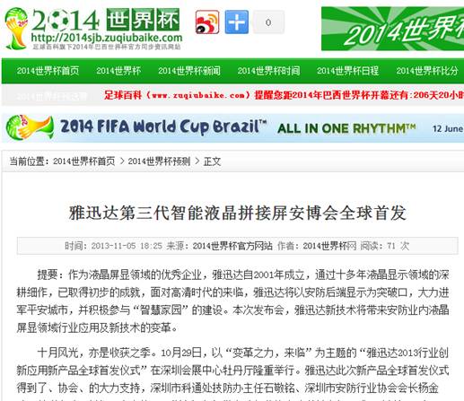另外,“2014世界杯官方網站”也對我公司液晶拚接屏進行了重點報道。據悉,我公司液晶拚接產品將應用於2014年巴西世界杯上,國外市場上,我公司的產品和解決方案已經延伸到歐洲、大洋洲和南美洲。2014年,世界人民將看到我們雅迅達產品,我公司正在為世界安全貢獻著自己的力量。