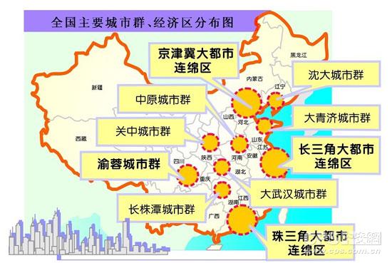 32個城市群包括已基本建成的11個城市群,包括珠三角、長三角、京津冀、山東半島、遼寧半島、長江中遊、中原、成渝、關中、海峽西岸、海峽東岸;其次是正在建設的14個城市群,包括武漢城市群、長株潭城市群、江淮城市群、呼包鄂城市群、蘭州城市群、烏昌城市群、黔中城市群、銀川城市群、拉薩城市群、太原城市群、石家莊城市群、滇中城市群、環鄱陽湖城市群、南寧城市群;另外是7個潛在城市群,包括豫皖城市群、冀魯豫城市群、鄂豫城市群、徐州城市群、浙東城市群、汕頭城市群、瓊海城市群。其中,豫皖城市群、冀魯豫城市群、鄂豫城市群均屬於區域級城市群,豫皖城市群包含城市:阜陽、亳州、商丘、周口;冀魯豫城市群包含城市:安陽、鶴壁、濮陽、聊城、菏澤、邯鄲;鄂豫城市群包含城市:信陽、南陽、襄樊、隨州、駐馬店。