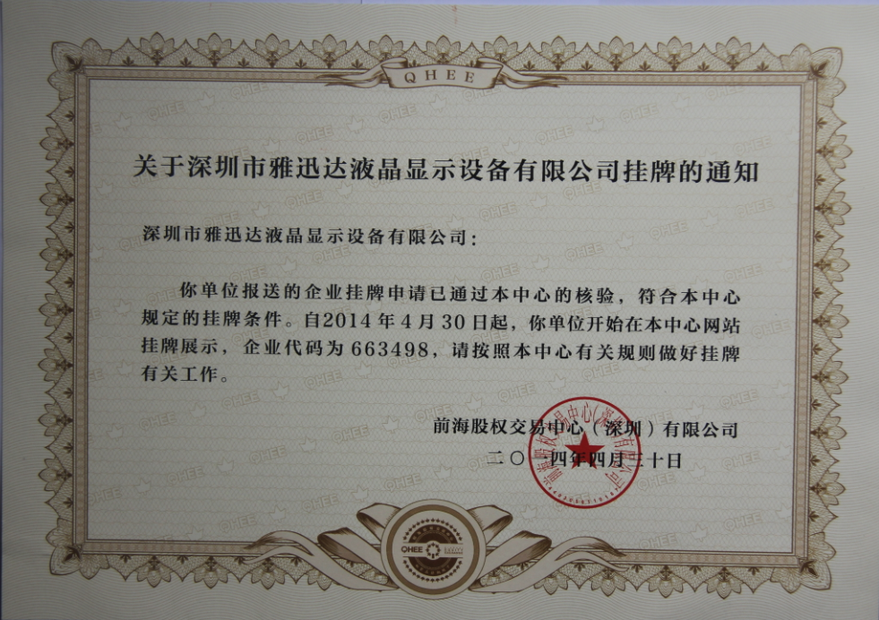近日,深圳市雅迅達液晶顯示設備有限公司在深圳前海股權交易中心掛牌展示,企業代碼為663498。日前,前海股權交易中心日前已通過核驗雅迅達的掛牌申請,於4月30日起在前海股權交易中心網站掛牌展示公司的有關信息。掛牌儀式將在近期舉行。
