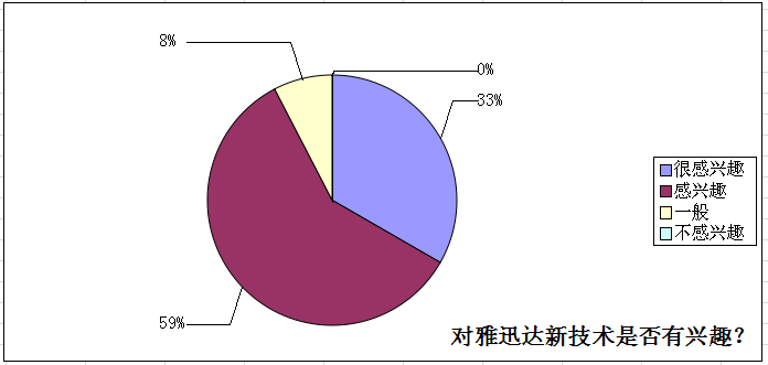 在針對雅迅達本次發布的三項技術——預監回顯、自動刷新頻率和自動調節背光亮度——關注度調查中,29.7%的客戶表示很感興趣,52.7%的客戶表示感興趣,一般感興趣的為6.8%。在(zai)新(xin)技(ji)術(shu)在(zai)項(xiang)目(mu)投(tou)標(biao)控(kong)標(biao)中(zhong)的(de)表(biao)現(xian)預(yu)測(ce)調(tiao)查(zha)中(zhong),超(chao)過(guo)一(yi)半(ban)客(ke)戶(hu)認(ren)為(wei)新(xin)技(ji)術(shu)能(neng)夠(gou)有(you)效(xiao)控(kong)標(biao),將(jiang)對(dui)項(xiang)目(mu)的(de)競(jing)標(biao)成(cheng)功(gong)產(chan)生(sheng)積(ji)極(ji)作(zuo)用(yong)。從(cong)數(shu)據(ju)看(kan)來(lai),本(ben)次(ci)雅(ya)迅(xun)達(da)中(zhong)國(guo)行(xing)上(shang)海(hai)站(zhan)活(huo)動(dong)表(biao)現(xian)成(cheng)功(gong),新(xin)技(ji)術(shu)的(de)市(shi)場(chang)反(fan)應(ying)良(liang)好(hao)。
