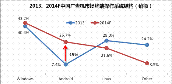 因“政府及公共場所”、“傳媒”等行業受經濟環境及政策影響,增幅與預期差距較大,且因其在行業內比重較大,所以將導致2014年廣告機市場的增長也未能達到預期。但是,因商業服務及零售、教育等細分行業需求旺盛,市場增幅超過預期10%。