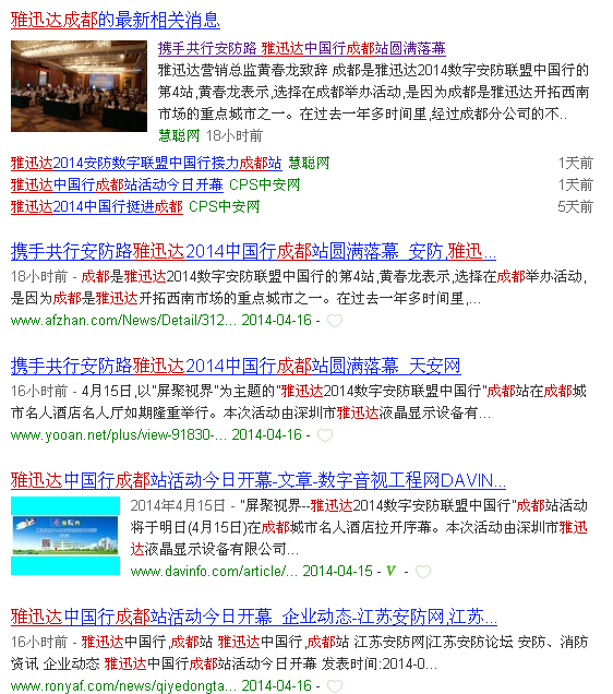 雅迅達中國行成都站搶灘各大網媒首頁 4月15日,以“屏聚視界”為主題的“雅迅達2014數字安防聯盟中國行”成都站在成都城市名人酒店名人廳如期舉行。截止今日,各大媒體對活動本身及由活動引發的安防融合發展道路的探討...