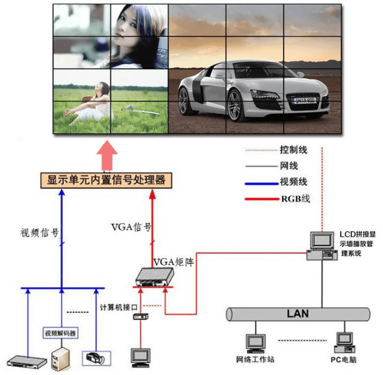 雅迅達55寸超窄邊液晶拚接牆項目解決方案 液晶拚接牆係統組成整套液晶拚接牆大屏幕顯示係統主要由以下幾部分組成:落地安裝機架,21台55寸lcd液晶拚接屏(三星原裝液晶麵板),應用管理軟件包線材及配件d、網絡化一體點屏控...