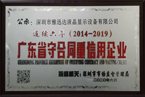 祝賀雅迅達再次獲得“守合同重信用企業”榮譽稱號 近日,經廣東省深圳市市場監督管理局審核批準,深圳市雅迅達液晶顯示設備有限公司獲得“守合同重信用企業”榮譽證書,這是雅迅達連續六年獲得該榮譽,公司憑借長期積累沉澱的強勁...
