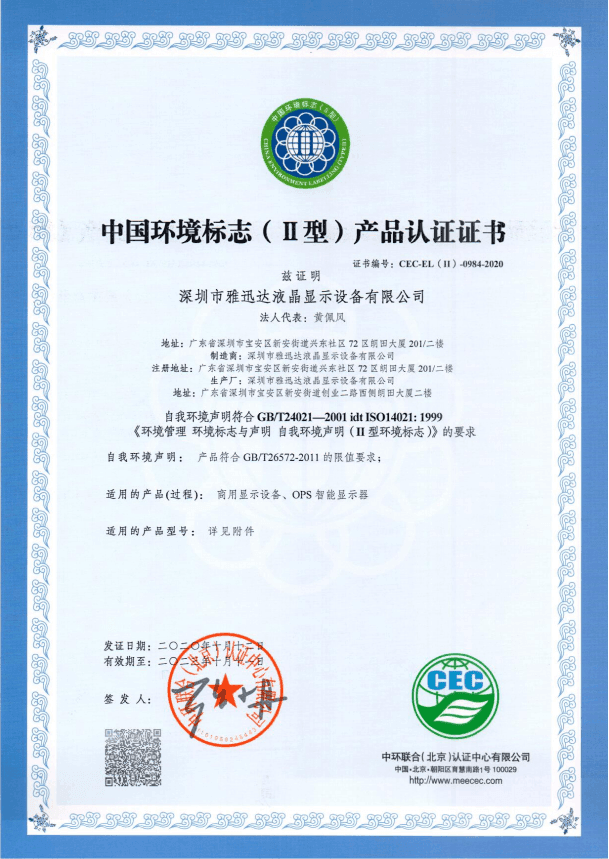 雅迅達榮獲中國環境標誌產品認證 近日,深圳市雅迅達液晶顯示設備有限公司榮獲中國環境標誌產品認證證書。