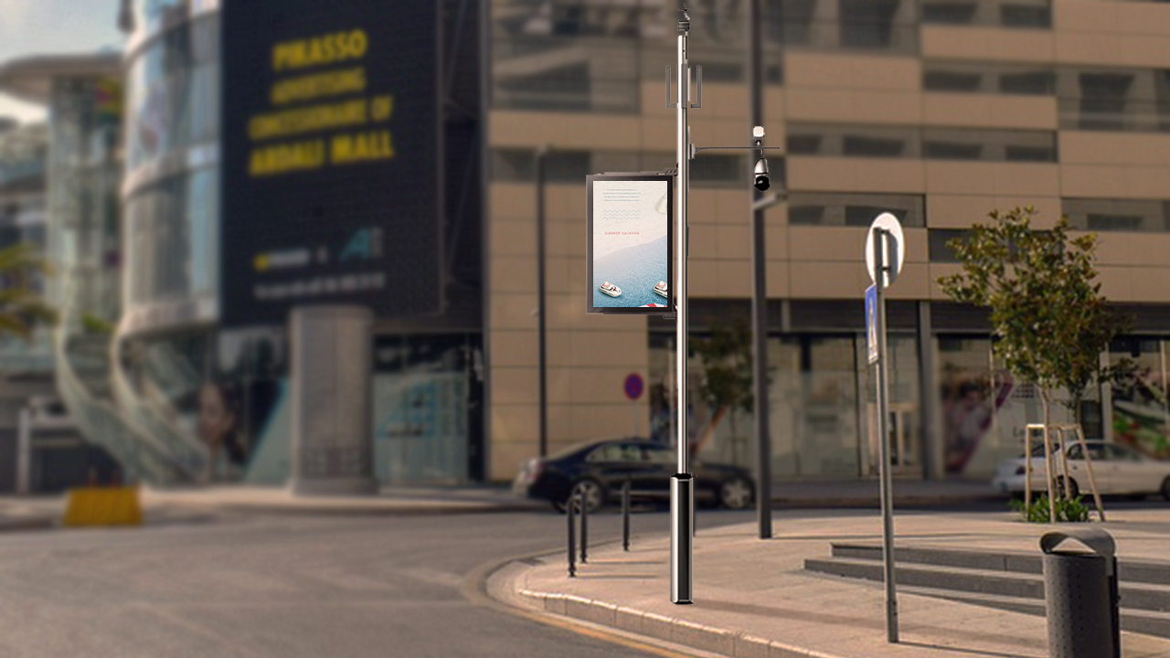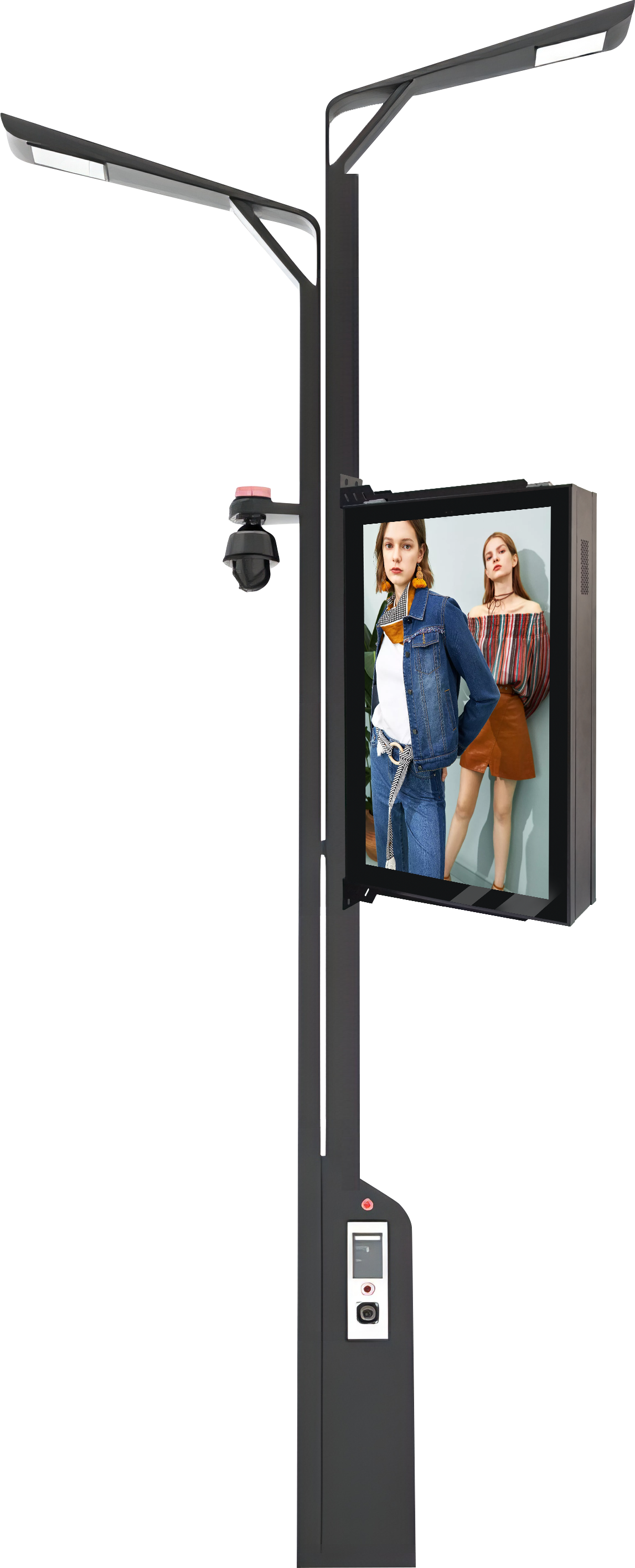 戶外燈杆屏采用全貼合設計,整機滿足IP65/IP55防護,支持單雙麵顯示,適用於智慧路燈等項目